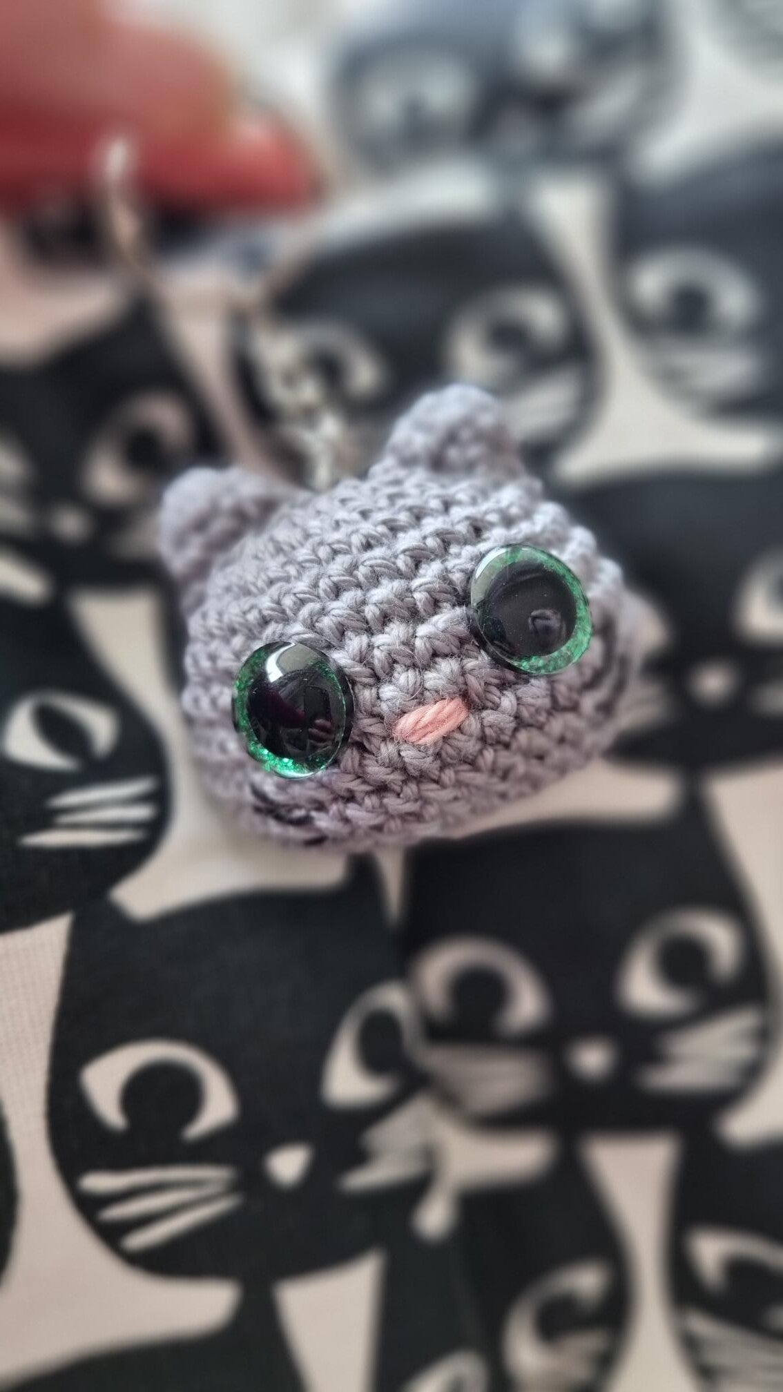 Anneau en acier inoxydable, chat en fil de coton bio, rembourrage en chutes de coton recyclé, yeux sécurité vérouillés par l'intérieur.